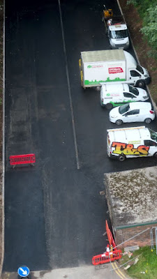 I meandered out onto the balcony... after a few minutes trying to get the sliding doors to slide. And took these update photographicalisations of the new car parking area, on Chestnut Lane, showing the progress made.